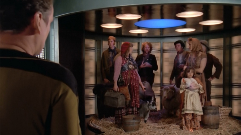 The episode sets up a clear contrast between Mariposans and Bringloidi. Mariposans are technologically advanced, neat and tidy, polite and refined, calm and ordered. When Enterprise crewmembers visit the colony, they see lots of white walls and stark, minimalist interiors. Also, as mentioned, the Mariposans do not have sex or feel sexual desire. The Bringloidi colony, in contrast, is agrarian, with only pre-industrial technology. They arrive on the Enterprise as dirty and unkempt as you might expect farmers to be, and one of the first to arrive is visibly pregnant. The colony leader asks Lieutenant Worf for alcohol and quickly gets drunk. The colony leader’s daughter seduces Commander Riker, and she shouts her disapproval at Worf for having provided her father with intoxicant. The effect of the contrast is that the Bringloidi are energetic, fertile, undisciplined, in touch with nature and natural human appetites, while the Mariposans are cold, sterile, disciplined, and dependent on technology. The contrast is not entirely to the Mariposans’ detriment, but it is largely so.