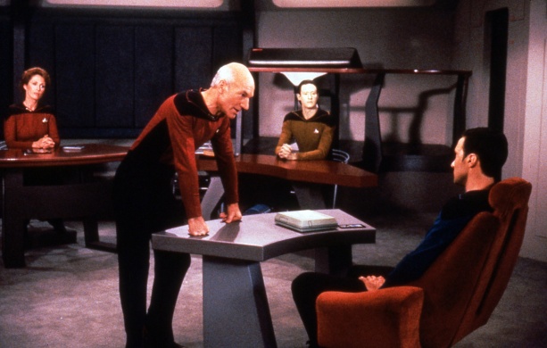 A clear successor to Asimov’s bicentennial man is the android Data from Star Trek: The Next Generation. In the episode “The Measure of a Man”, Data is put on trial to determine whether he is a person with a right to refuse to participate in a Starfleet experiment or whether he is Starfleet property with no such right. (This in a universe where humans are not the only species considered persons with rights.) Commander Bruce Maddox wishes to perform the experiment over Data’s objections and so claims that Data is property. He refers to Data impersonally as “it”. Although the episode features legal arguments that Data is property (that he is mechanical, that he can be disassembled, that he can be switched off), Captain Picard’s arguments for Data’s personhood (that he is sentient, intelligent, self-aware, and conscious) are portrayed as both more moral and more convincing. Picard concludes that if Maddox succeeds in having Data classified as property and if his experiment allows the creation of many androids like Data, then the Federation will own a race of slaves. Data is ruled to be a person rather than property, and Maddox finally refers to Data as “he”. This episode follows the Star Trek tradition of happy endings in which the morality of the main characters triumphs over contrary positions.