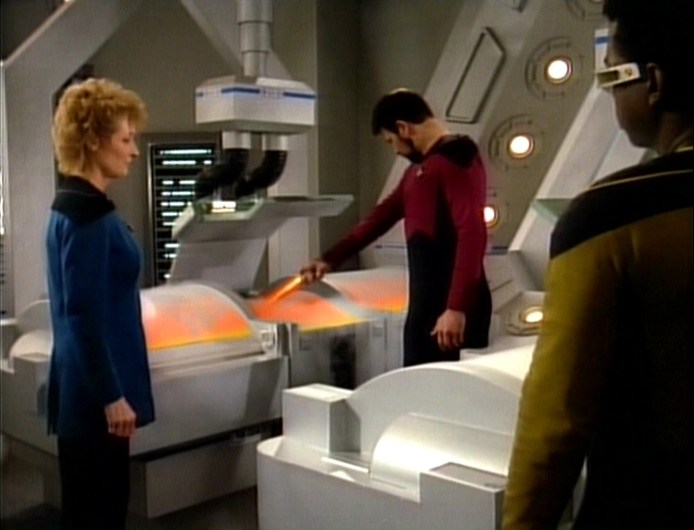 I do not know whether the writers of this episode were thinking about abortion, but the parallels to abortion are striking. Riker and Pulaski have genetic offspring that they do not want. The offspring are sealed off from the environment as if in artificial wombs. Although we can see their faces, they appear to be asleep or in stasis, eyes closed, expressions neutral, so that we cannot tell whether they are sentient or aware. If allowed to mature, they will certainly be people like the Mariposans. Whether they are yet people at the moment Riker kills them is the question.